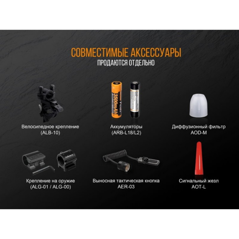 При необходимости, к фонарю Fenix TK25 Red можно отдельно купить выносную кнопку, крепление на оружие или велосипедный руль, рассеивающие фильтры. Этот тактический фонарь совместим со многими дополнительными аксессуарами, что делает его еще более многофункциональным.