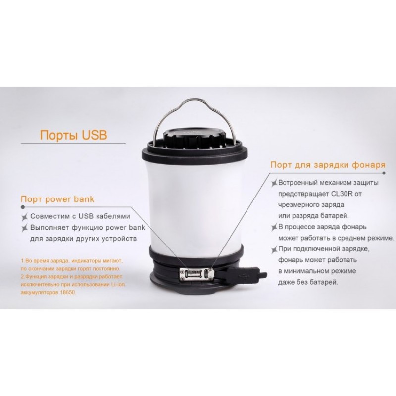 Для работы фонаря потребуются аккумуляторы размера 18650. Полный набор включает три элемента питания, но если окажется необходимым, данная модель в состоянии работать и на одном или двух аккумуляторах. В этом случае длительность работы фонаря уменьшится. Производители также привели данные о времени автономной работы данной модели при использовании фирменных аккумуляторов на 2600 мАч и на 3400 мАч. Для режима Turbo это 4 с половиной и 6 часов, для режима High — 9 и 12 часов, для режима Mid — 38 и 51 час, для режимов Low и Flash — 70 и 93 часа, для режима Eco — 300 и 400 часов. Таким образом, емкость и качество элементов питания напрямую влияет на период автономной работы кемпингового фонаря.