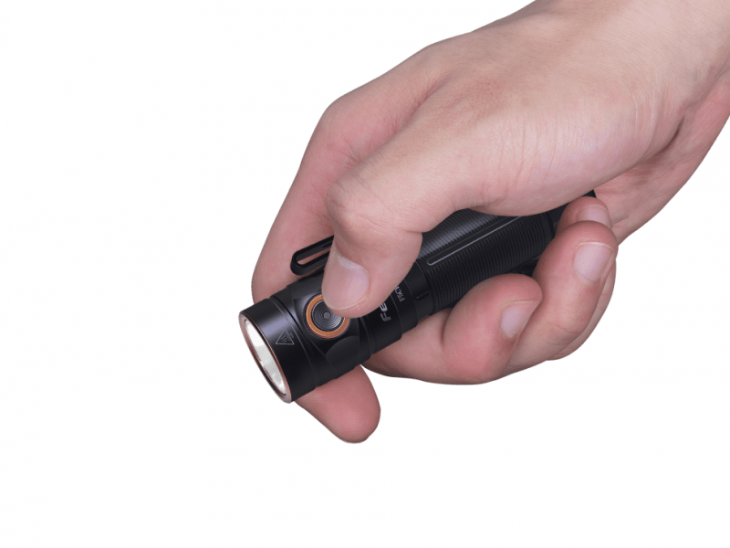 Модель Fenix E30R действительно просто управляется. На корпусе фонарика размещена только одна кнопка, которая вынесена на боковую сторону ближе к зоне головы, чтобы на нее было удобно нажать пальцем. При необходимости срабатывание кнопки легко блокируется, чтобы фонарь случайно не разрядился, включившись в кармане.