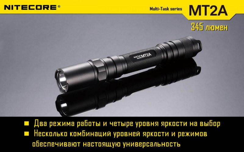 Фонарь Nitecore MT2A основан на базе одного светодиода Cree XP-G2 R5 и имеет гладкий, глубокий рефлектор. Максимальная мощность достигает 345 люмен. В качестве элементов питания светодиодный фонарь Nitecore МТ2А использует 2 аккумулятора Ni-MH АА (1,2V) или батарейки типа АА. Данный фонарь имеет универсальное питание - от аккумуляторов или от батареек. Фонарик незаменим для каждодневного использования как карманный фонарь, для охотников, рыбаков и всем кому нужна качественная и надежная подсветка.