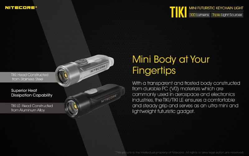 Очередная новинка в семействе наключных фонарей от компании Nitecore!TIKITIKI LE дает мягкий свет мощностью до 300 люмен благодаря светодиоду OSRAM P8 и невероятно гладкому рефлектору. Прозрачный корпус фонаря изготовлен из прочного поликарбоната, часто используемого в аэрокосмической промышленности. Поэтому ультракомпактный, легкий футуристичный TIKITIKI LE так удобно держать в руке. Голова фонаря (у TIKI из нержавеющей стали, у TIKI LE - из алюминиевого сплава) отлично рассеивает избыточное тепло. Универсальное вспомогательное освещение TIKI оснащен вспомогательным ультрафиолетовым светодиодом и белым светодиодом c высоким показателем передачи цветовой температуры. TIKI LE оснащен дополнительным красным и синим светодиодом. Кемпинг и чтение: вспомогательный светодиод TIKI излучает белый свет, в котором объекты освещены в максимально точных цветах, что делает фонарь идеально подходящим для чтения или использования в кемпинге. Проверка купюр: вспомогательный ультрафиолетовый светодиод TIKI(500мВ, 365nm) позволяет выявлять поддельные купюры и документы, может служить химическим тестером на флюоресцентность или для привлечения насекомых. Сигнальный маяк: вспомогательные красный и синий света TIKI LE могут быть использованы как маркер местоположения различных групп людей и как сигнальный маяк для кемпинга или во время прогулки. Предупредительные сигналы: режим красно-синего мигания фонаря LE может быть использован для привлечения внимания приближающихся транспортных средств или пешеходов во избежание потенциальной опасности. Интуитивно-простое управление одной кнопкой. Во избежание случайного включения фонаря применена следующая схема управления: нажатие и удержание кнопки активирует режим максимальной яркости; быстрое двойное нажатие включает фонарь; быстрое тройное нажатие активирует вспомогательное освещение. До 40 часов работы, подзарядка через USB. Фонари TIKI и TIKI LЕ оснащены технологией автоматического отключения, благодаря которой фонари готовы к работе до 365 дней от одной зарядки. Интегрированный аккумулятор емкостью 130мАч обеспечивает до 40 часов непрерывной работы, что сопоставимо по эффективности батарейке ААА. Благодаря нескольким системам защиты при зарядке фонарь можно заряжать от различных источников питания даже во время использования.