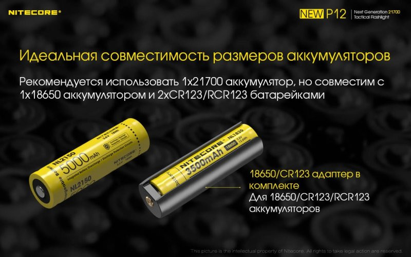 Аккумулятор 21700 является основным и рекомендуемым к использованию элементом питания, но также фонарь NEW P12 работает и от аккумуляторов 18650 и CR123/RCR123, только с использованием специального адаптера-переходника устанавливаемого в отсек для аккумуляторов в фонаре.