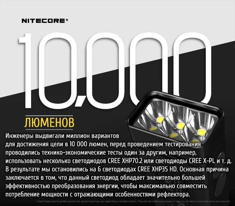 Этот фонарь работает с оптическим узлом, собранным из 6 светодиодов. Это высокопроизводительные модели Cree XHP35 XD. Они очень эффективно преобразуют энергию и суммарно дают яркость до 10 000 люмен. Чтобы диоды не перегревались во время такой работы, они интегрированы в медную пластину толщиною 4 мм, которая обеспечивает своевременное отведение тепла. Кроме того, время работы в наиболее мощном режиме ограничено и фонарь автоматически снижает яркость, чтобы остыть.