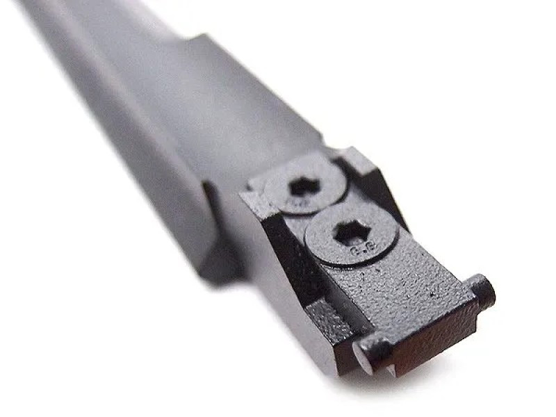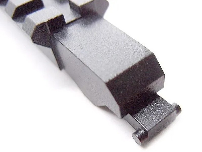 Передний носик фиксируется в целике, при этом дальномерную планку необходимо снять. Конструкция предусматривает небольшой припуск по размерам, что позволяет выполнить точную подгонку самостоятельно при помощи надфиля. Задний крепёжный болт устанавливается на место чеки крышки ствольной коробки и полностью выполняет её функцию.