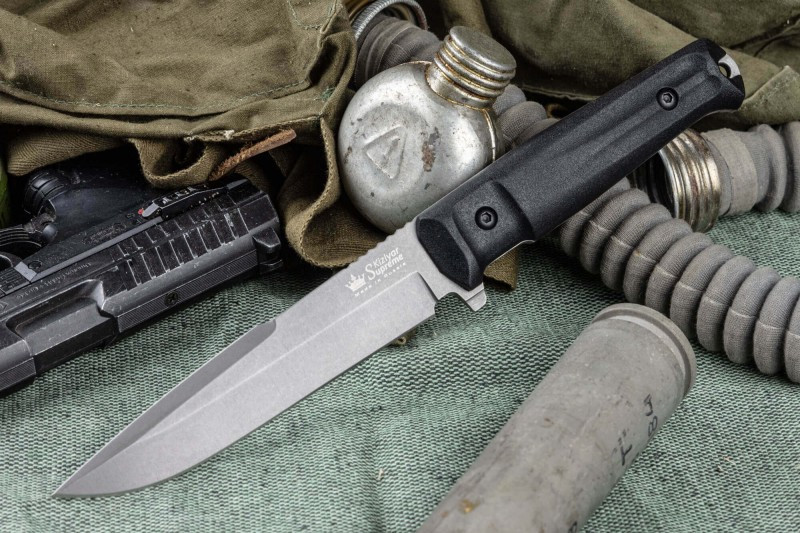 Конструкция ножей простая, но максимально прочная: накладки рукояти, изготовленные из Kraton, известного своей износоустойчивостью к истиранию и повышенными фрикционными качествами, прикручены к цельнометаллическому хвостовику резьбовыми стяжками, а также дополнительно проклеены. Стоит отметить, что рукоять идеально совместима с тактическими перчатками.