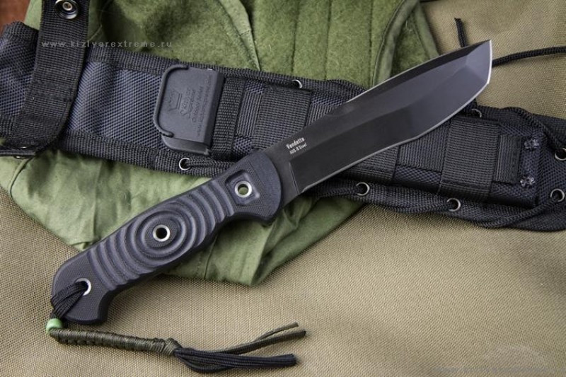 Vendetta с клинком из заслуженной ножевой стали AUS-8 с толстым черным покрытием Black Oxide, рукоятью из очень прочного G10 и полностью MOLLE-совместимым чехлом из баллистического нейлона и стеклонаполненного полиамида.