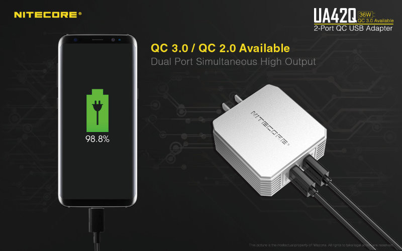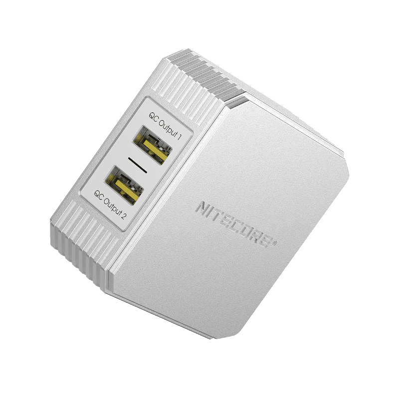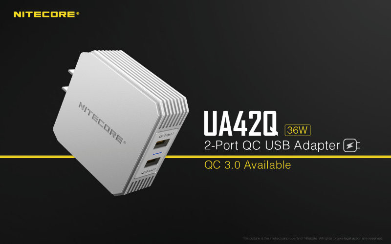 Питание сетевому блоку питания обеспечивает стационарная сеть с напряжением 220V. Хорошим преимуществом данного устройства, является в первую очередь его компактный размер с корпусом выполненного из поликарбоната, и функция быстрой зарядки по технологии Quick Charge 3.0 с максимальным выходным током до 2.1А на два порта одновременно. Также поддерживает и зарядка QC 2.0, что позволит Nitecore UA42Q автоматически определять максимально допустимый ток для зарядки подключенного устройства. Максимальная исходящая мощностью 36W.