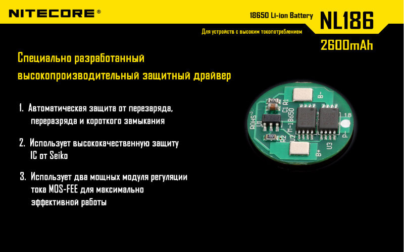 - Nitecore NL186 имеет интегрированную защитную плату от переразряда и перезаряда;