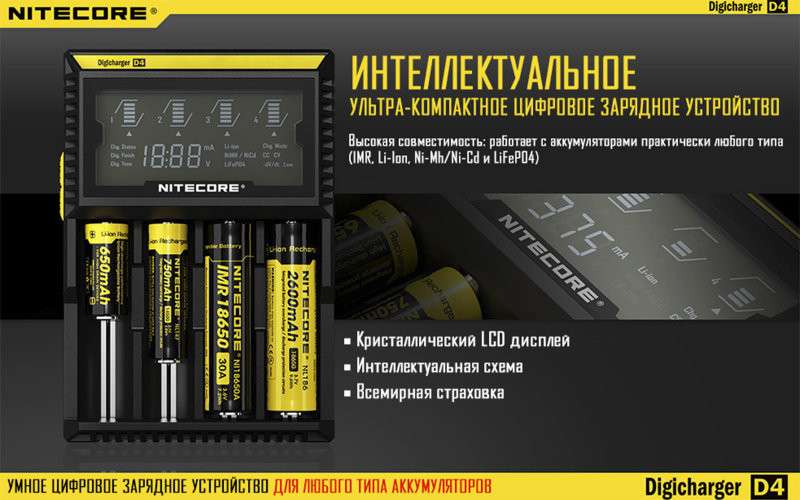 - устройство Nitecore Digicharger D4 имеет 4 независимых друг от друга слота зарядки (то есть ЗУ D4 может заряжать одновременно четыре совершенно разных аккумулятора);