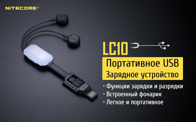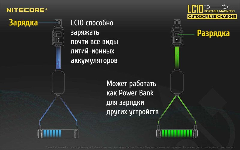 - Nitecore LC10 способна заряжать Li-ion и IMR аккумуляторы, а также использовать их для зарядки внешних устройств;