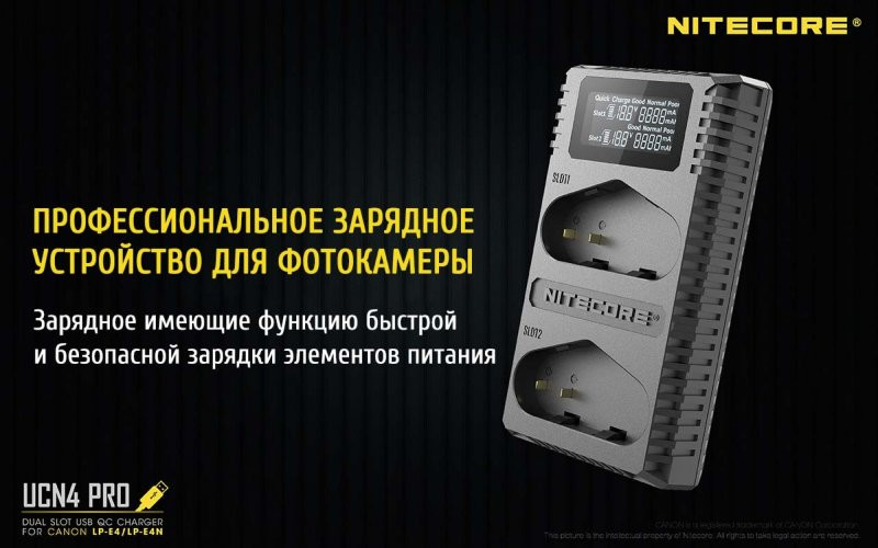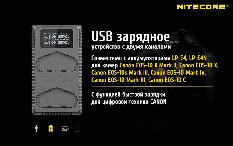 Nitecore UCN4 PRO, как устройство предназначенное для заряжания элементов питания фотоаппаратов, совместима со следующими типами аккумуляторов: LP-E4 и LP-E4N. Данный типоразмер в свою очередь совместим с: