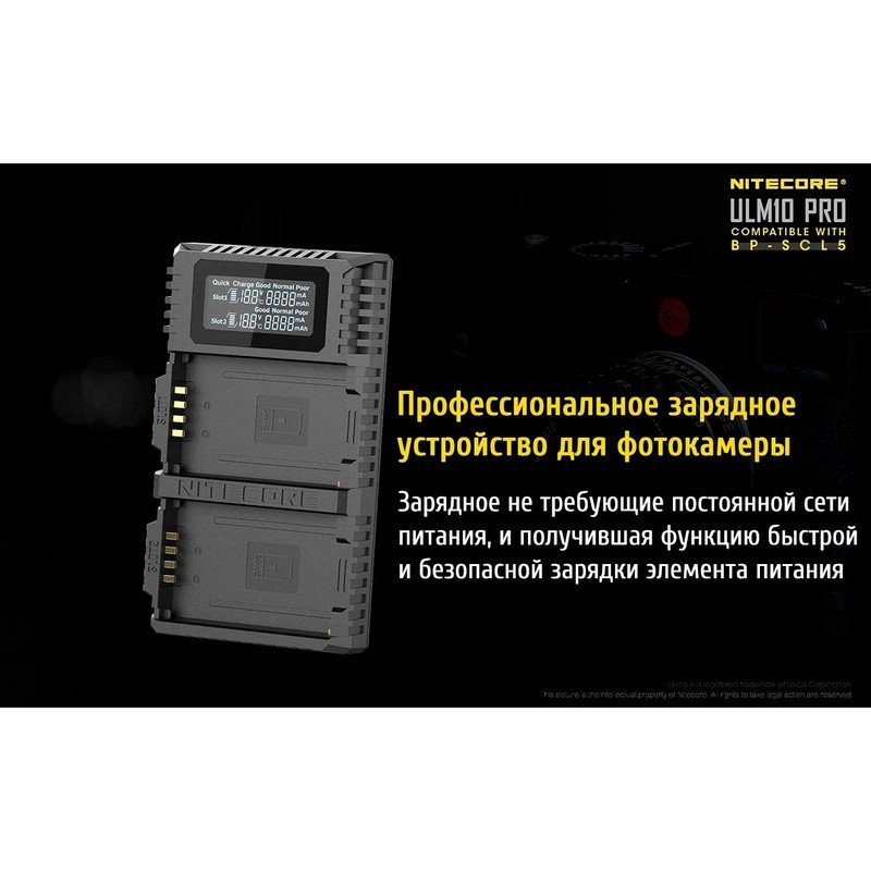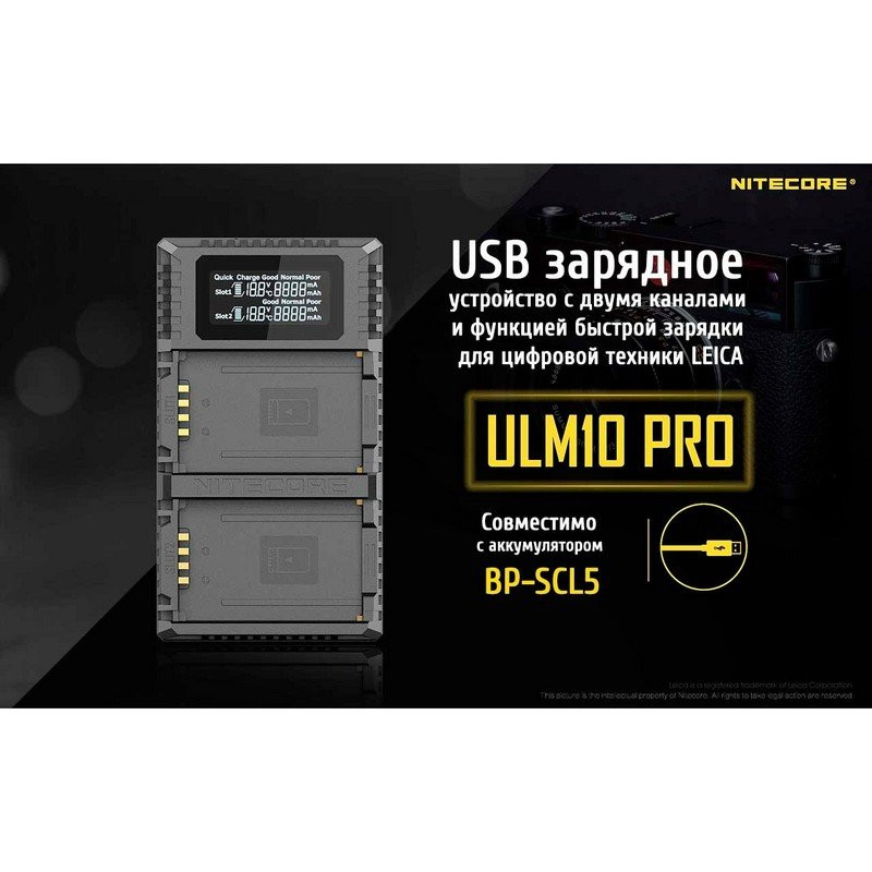 Функциональное, и в то же время очень практичное зарядное устройство для одной из самых уникальных моделей цифровых камер Leica M10 - Nitecore ULM10 PRO. С представленной новинкой, расширяется ряд зарядных устройств, имеющих отдельную серию и разработанной индивидуально для каждого класса фототехники в зависимости от модели и бренда. Линейка зарядок для фотоаппаратов Leica имеет самый широкий ряд моделей, которые насчитывает целых 5 устройств, которые предназначены для разных типов элемента питания.