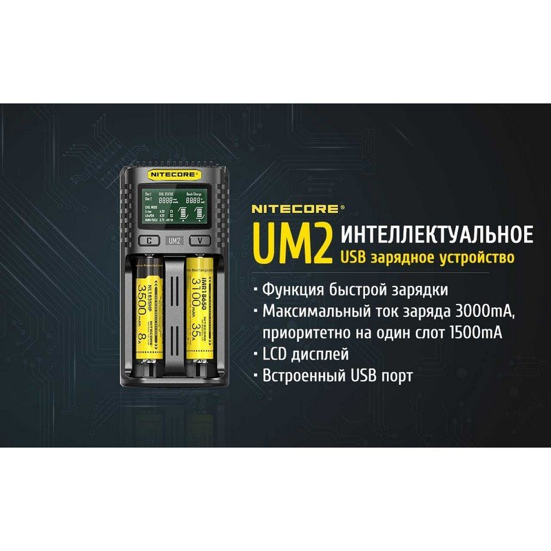 Совершенно новое зарядное устройство, предназначенное для одновременной зарядки двух элементов питания разного типоразмера - Nitecore UM2. Представленное устройство может заряжать не только разные по типоразмеру, но и разные по объёму аккумуляторы. Основным преимуществом зарядного прибора от компании Найткор, является встроенная инновационная технология быстрой зарядки по технологии Quick Charge 2.0, обеспечивающая при максимально исходящем токе в 1.5А, зарядить за 2 часа до 80% заряда аккумулятор емкостью 3500mAh.