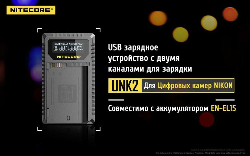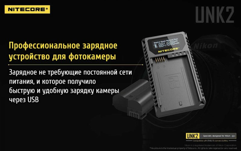Презентованное устройство поддерживает определенный тип батареи EN-EL15 используемых исключительно в цифровой технике Nikon. Основным преимуществом UNK2 является встроенный USB кабель, с помощью которого зарядку аккумуляторов можно производить в любых удобных условиях, это может быть и на природе, во время путешествия или просто прогулки.