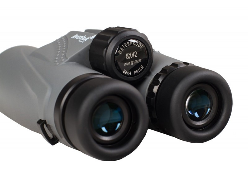 Компания Levenhuk позаботилась об удобстве использования бинокля: вы можете менять межзрачковое расстояние, регулировать положение бинокля относительно глаз, корректировать диоптрии. Плотное светло-серое резиновое покрытие корпуса защищает прибор от механических повреждений. Бинокль удобно держать в руках.