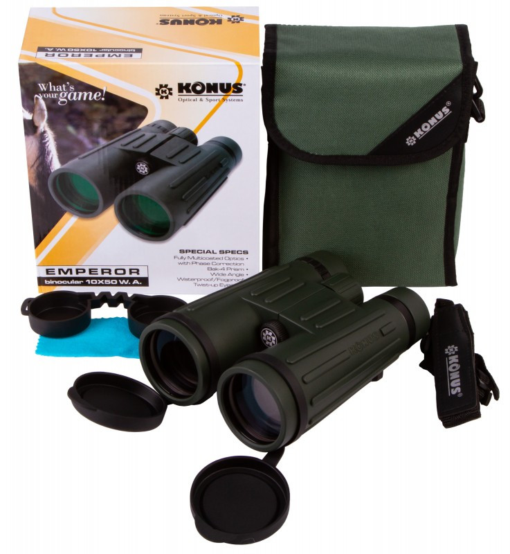10-кратный полевой бинокль Konus Emperor 10x50 WA – это оптический прибор для охотников, рыбаков, походников, орнитологов и натуралистов. Он идеально подходит для любых наблюдений на открытых пространствах, к тому же совершенно неважно, при каких условиях они ведутся. Бинокль идеально работает и в солнечные дни, и в сумерках, и при сильном ливне, и в мороз. Он всепогодный, неприхотливый и надежный.