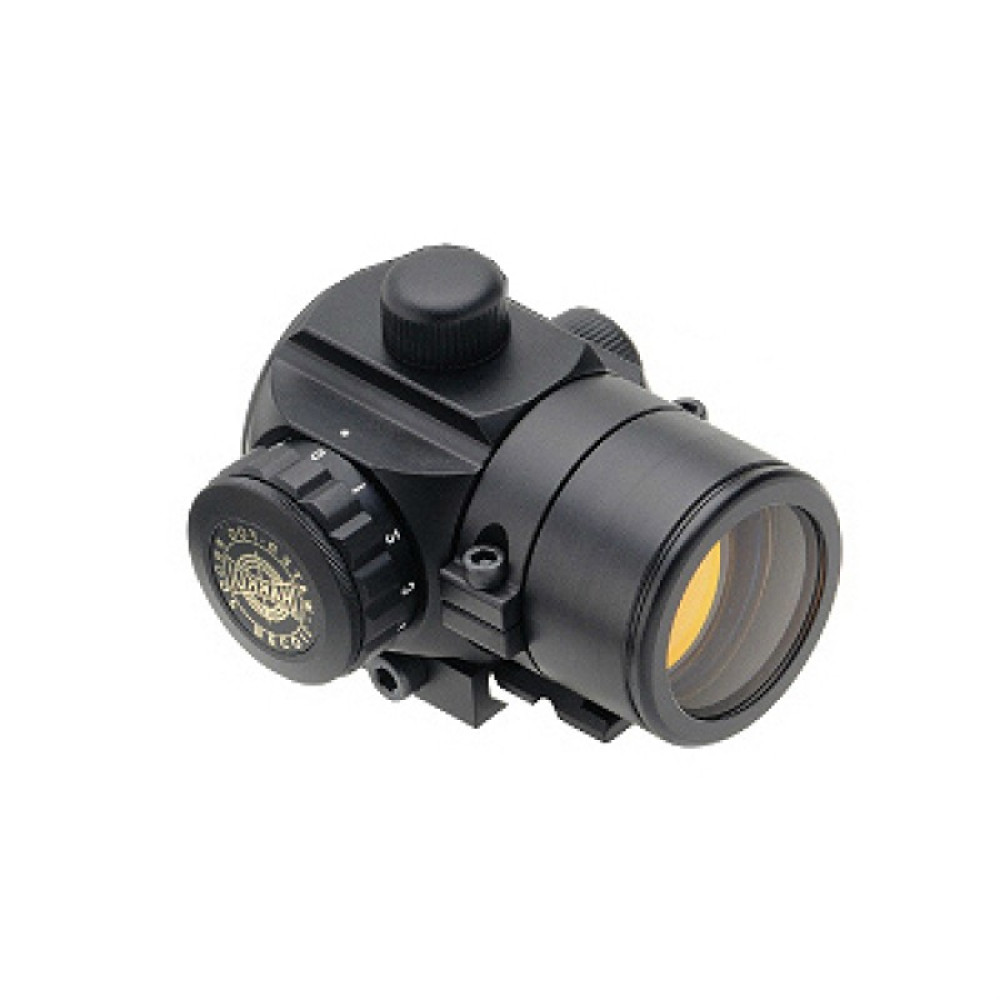 Прицельная марка имеет вид точки размером 4 МОА, что больше подходит для работы на среднюю и крупную дичь в пределах 200 метром и ближе. При этом расстояние отсутствия параллакса составляет 100 метров.11 степеней яркости с промежуточными положениями, при котором прицел выключается. Один клик регулировочного винта в любое направление составляет 1_4 МОА или 7 см на 100 метров.
