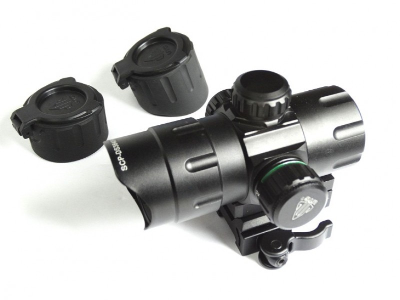 Одним из важных элементов модели SCP-DS3840W можно считать крепежное основание. Прицел устанавливается на стандартизированную во всем мире планку Weaver 21 мм. При этом рычажная система обеспечивает быструю установку или снятие для транспортировки или смены оптики без потери пристрелочных данных. Основание съемное, крепится к прицелу двумя винтами. Между основной зажимной частью и прицелом установлена съемная проставка, с помощью которой можно выставлять прицел на низко расположенных планках, а также при использовании дополнительного магнифера. Помимо высоты возможна регулировка по горизонтали. Коллиматорный прицел не требует определенного положения удаленности выходного зрачка, но бывает случаи небезопасного или неудобного положения в связи с индивидуальными особенностями стрелка, а также в случаях ограниченной длин посадочного места. При желании проставку можно убрать.