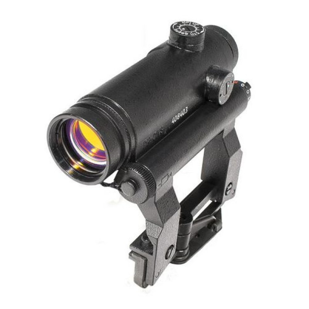 Прицельная марка - светящаяся точка красного цвета. Степень яркости регулируется ступенчатым переключателем. Количество степеней яркости - 8. В крайних положениях переключателя прицел выключен. Положение переключателя в значении "К" позволяет контролировать степень разряда элемента питания, если в этом положении свечение прицельной марки отсутствует, значит элемент питания разряжен не менее чем на 95% и его следует заменить. Источник питания прицельной марки - 1 батарея типоразмера АА, напряжением 1,5В. Низкое энергопотребление обеспечивает не менее 400 часов работы без замены батареи.