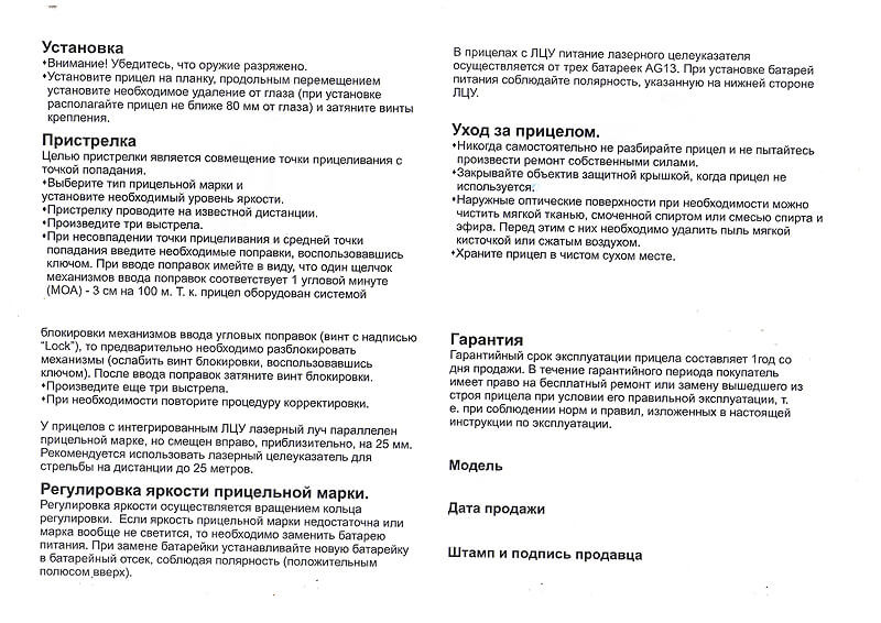 В случае возникновения проблем с эксплуатацией прицела, пожалуйста, верните прибор продавцу для ремонта или замены. Гарантия аннулируется и считается недействительной, если прибор был изменен, подделан, модифицирован или неправильно использован, подвергся падению или несанкционированному ремонту.