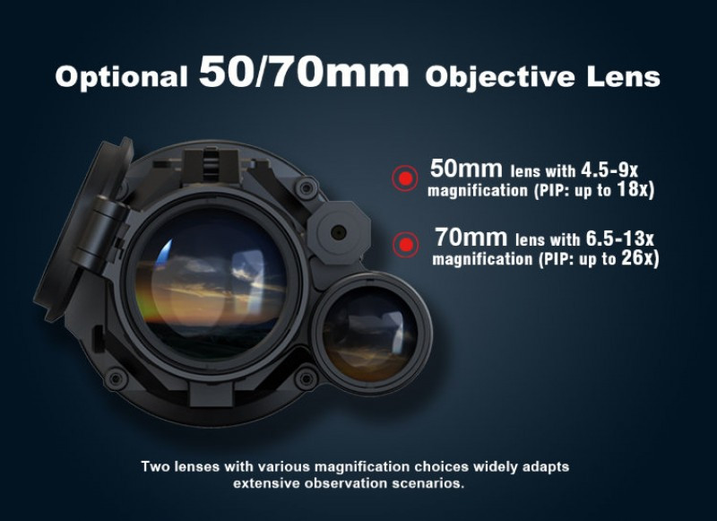 - Объектив 50 мм. Кратность 4,5x и 9x, с опцией PiP до 18x.