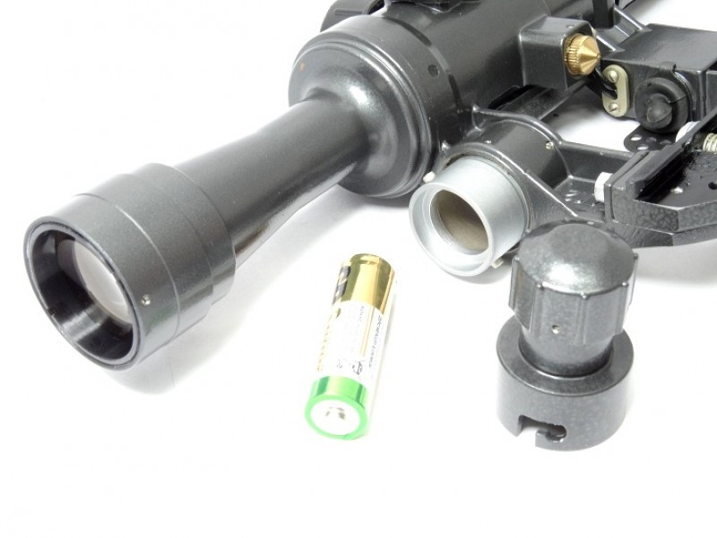 ![]() | Прицел имеет подсветку прицельной сетки. В качестве элемента питания выступает пальчиковая батарейка (тип АА). В старых образцах прицела подсветка работала от лампы накаливания 3В, питалась от РЦ63. Такой элемент питания давно не выпускается, и решение установить распространенную батарею было естественным. На данный момент во всех прицелах этой серии установлен диод красного цвета с напряжением 1,5 В. Энергопотребление диода очень мало и батарейки хватает на долгие сроки. Очень важно учитывать о минусах одноразовых батарей при отрицательной температуре. В зимние охоты предпочтительно использовать аккумуляторные батареи того же типоразмера. Для включения на кронштейне установлен тумблер. Цвет подсветки можно охарактеризовать как морковный, расчет велся для работы в сумеречное и предрассветное время. Подсвечивается вся прицельная марка. |
