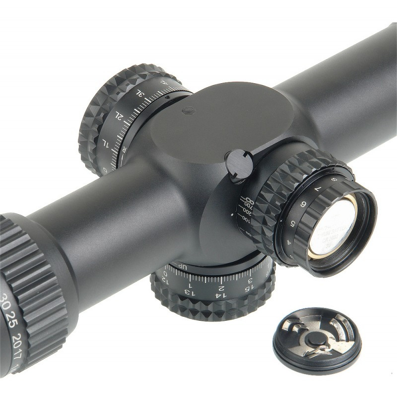 Большие тактические барабаны с насечками удобны для введения поправок прямо в перчатках. Клики маховиков четкие, ясно различимые. Цена 1 клика – 0,1 mrad (примерно 1 см на 100 м). Для сброса на "0" после выверки прицела крышки барабанов снимаются, нулевая отметка на барабане совмещается с риской на его неподвижном основании, затем винт в крышке барабана затягивается с помощью монеты.