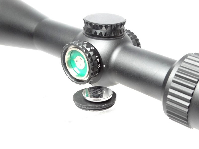 Тип прицельной сетки – MillDot, это современная сетка, имеющая дополнительные точки во всех 4 направлениях для удобства введения поправок, не используя регулировочные винты. В зависимости от баллистики пули и погодных условий используется одна из точек для прицеливания. В прицеле установлена система подсветки сетки. Для контраста относительно различных местностей на выбор дается 2 цвета – синий и зеленый. При определенном свете или его отсутствии выставляется яркость сетки. Все режимы выполняются одним маховиком на боковой части прицела, который, одновременно, является батарейным отсеком.