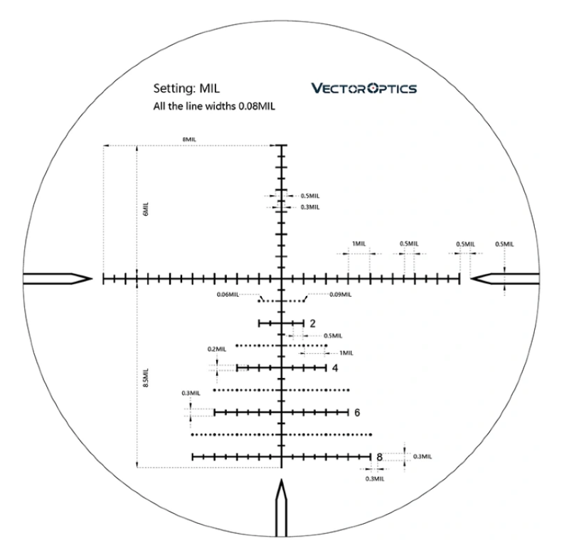 Баллистическая сетка VPA-MF — модифицированный Mil-Dot с разметкой в 0,5 и 1 мил и вертикальной «ёлочкой», что обеспечивает множество дополнительных точек прицеливания по мере увеличения дальности стрельбы. Марка находится в I фокальной плоскости (FFP), т. е. угловые значения элементов верны при любой кратности; разметка очень тонкая (толщина линий 0,8 mil), и небольшие цели хорошо просматриваются даже при 24x.