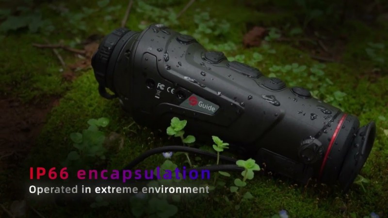 Тепловизионный монокуляр Guide kitalpha TK451 надежно защищен от проникновения влаги, о чем подтверждает класс IP66. Прибор не боится падения с высоты 1 м, эксплуатировать его можно при сильных осадках (проливной дождь, мокрый снег, буря). Переносной монокуляр можно использовать для наблюдений в стационарном положении, на корпусе есть разъем UNC _"-20.