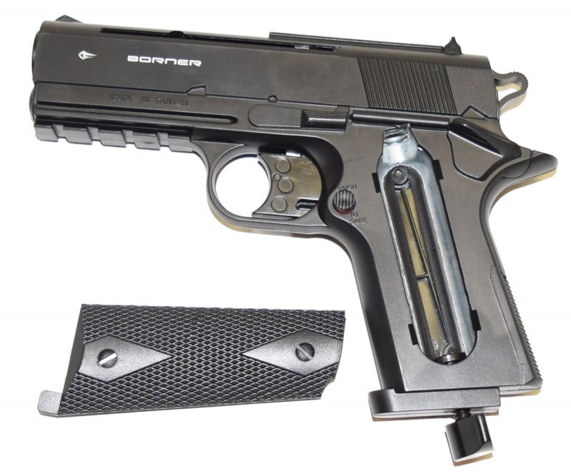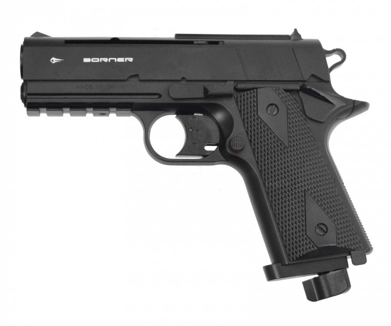 Низкая стоимость бюджетной пневматики Borner WC 401 нисколько не умаляет ее качественных характеристик. Выполненное из пластика оружие имеет хорошую мощь. Любители развлекательной стрельбы по достоинству оценят пневматику от производителя из Тайваня. Вес пистолета - 350 гр.