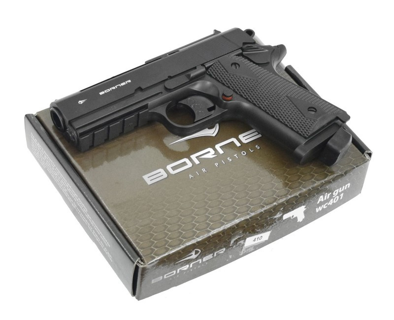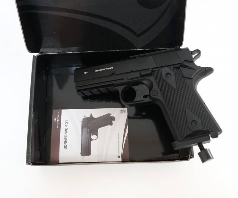 Аккуратная пневматическая модель пневматики Borner WC401 внешне очень похожа на известный боевой Colt 1911, имеющий укороченный ствол. Недействующие элементы выполняют декоративную функцию. Качественное литье рычага затвора, курка и рычага предохранителя делают внешний дизайн весьма реалистичным. Под стволом установлена рельса, предназначенная для монтажа фонарика либо лазерного указателя цели. Фотографии пистолета не передают его фактической привлекательности, оружие нужно подержать в руках.