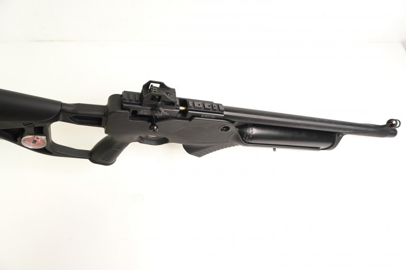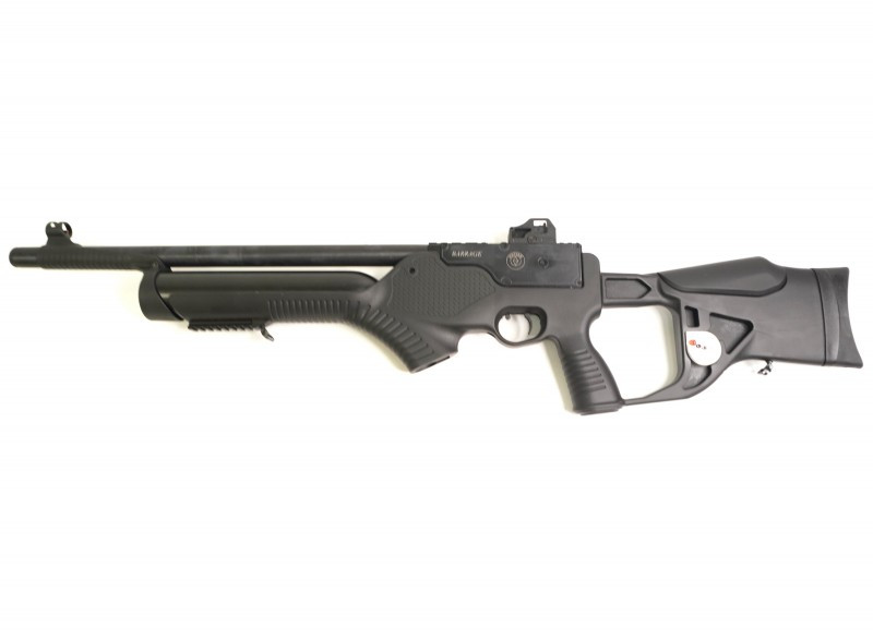 В качестве магазина здесь установлен барабан-клип на 10 снарядов - пуль калибра 6,35 мм. Винтовка Hatsan Barrage отличается установкой запатентованной системы, защищающей оружие от потерь сжатого воздуха в случае его удара о твердый предмет. Взвод винтовки боковой, режим огня - полуавтоматический.