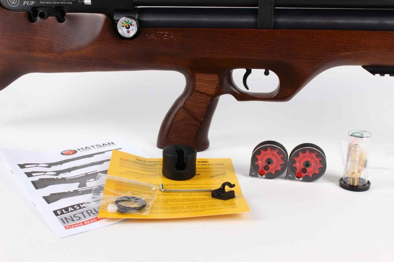 Так как оружие поставляется в ослабленном виде, скорость вылета боеприпасов составляет 100 м/с, после мероприятий этот показатель можно довести до 265 м/с. Режим стрельбы одиночный, взвод винтовки боковым рычагом. За счет использования в конструкции этого оружия запатентованной производителем системы предотвращения уменьшения объема сжатого воздуха при механических ударах винтовка Хатсан Флэшпап КьюЕ 6,35 мм отличается надежностью и долговечностью.