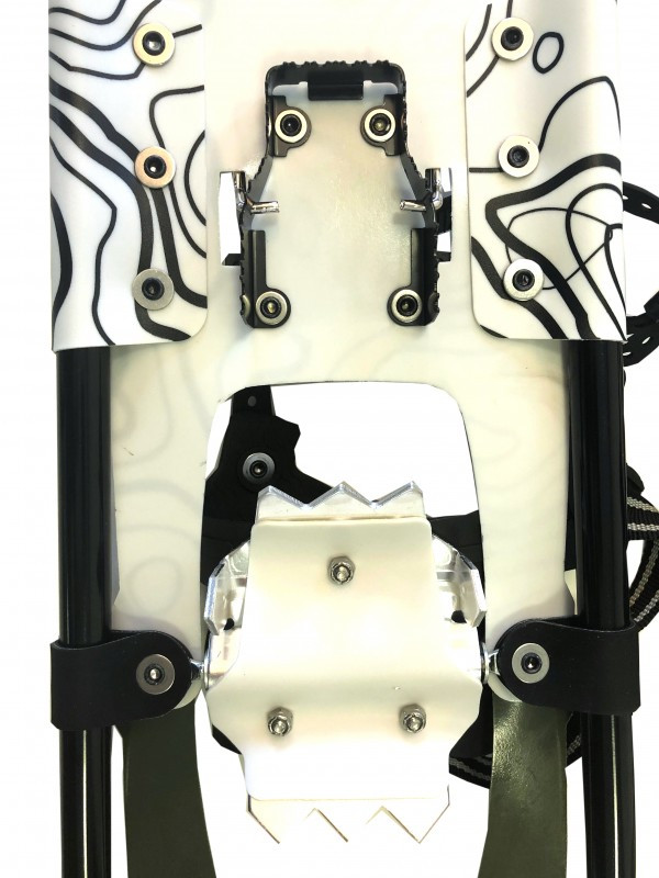 - Технология Heel Rising: снегоступы имеют подпяточник - конструкцию, обеспечивающую подъём пятки для удобного совершения подъёма в гору, на холм. Конструкция складываемая. В базовом положении, при равнинной ходьбе, подпяточник сложен и равен поверхности зоны пятки на полотне