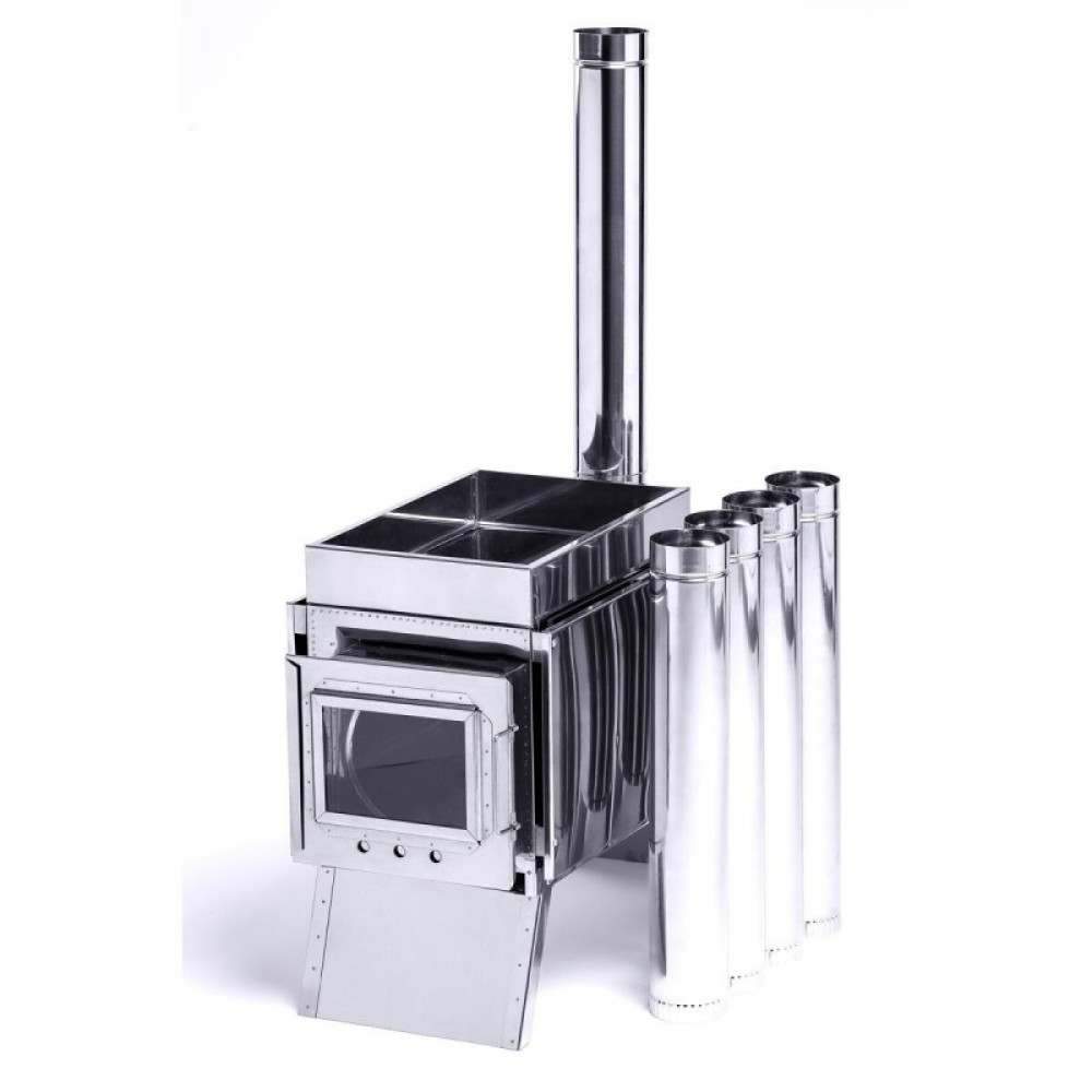 Состоит из металлического короба с внутренней перегородкой-искрогасителем с оснащенным выходом под дымоходную трубу, имеет четыре стационарных защитных экрана, съемный короб для закладки камней, складные ножки и дымоходную трубу, состоящую из сегментов. Топочное отверстие имеет дверцу с ручкой в виде слайдерной крышки с термостойким стеклом и отверстиями для регулировки тяги. Данная конструкция печи, позволяет экономить топливо (отрегулирована сила потока тяги), разогревать и готовить пищу, с помощью съемного короба размещать камни для использования печи в бане.