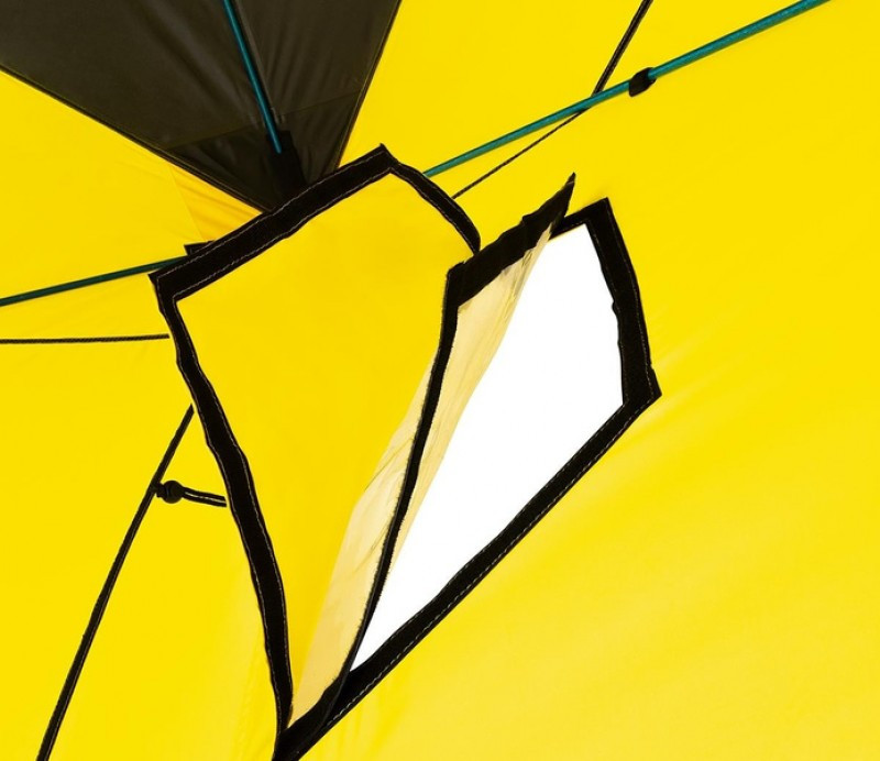 Металлический узел соединения дуг каркаса в отличие от пластиковых выдерживает даже очень сильные морозы. Прочная водостойкая ткань тента (полиэстер 300D, PU 2000 мм) надежно защитит от ветра и атмосферных осадков. Проклеенные швы на крыше палатки препятствуют проникновению влаги в палатку. Тент палатки выполнен из желтой ткани, которая позволяет пропускать дневной свет во внутрь палатки, благодаря чему можно рыболов имеет возможность ловить рыбу в дневное время без подсветки дополнительными осветительными приборами. Крыша палатки выполнена из черного цвета, в солнечный день она поможет быстрее прогреть палатку.
