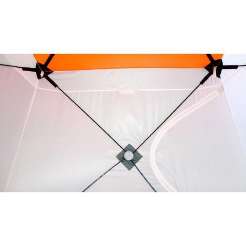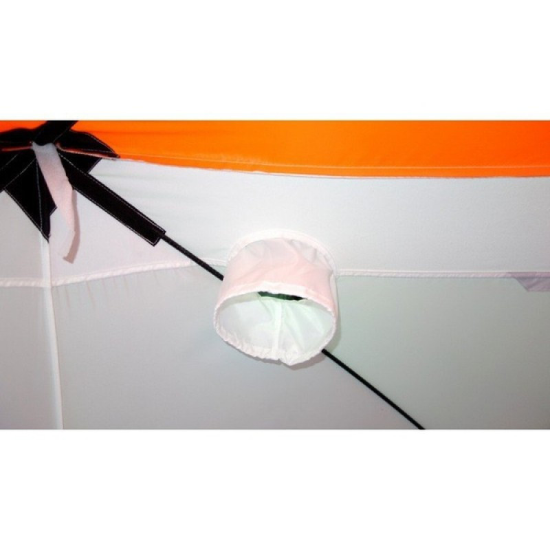 - При креплении укрытия на льду распределять растяжки симметрично по всему периметру, что поможет избежать перекоса и чрезмерной нагрузки на молнию входной двери