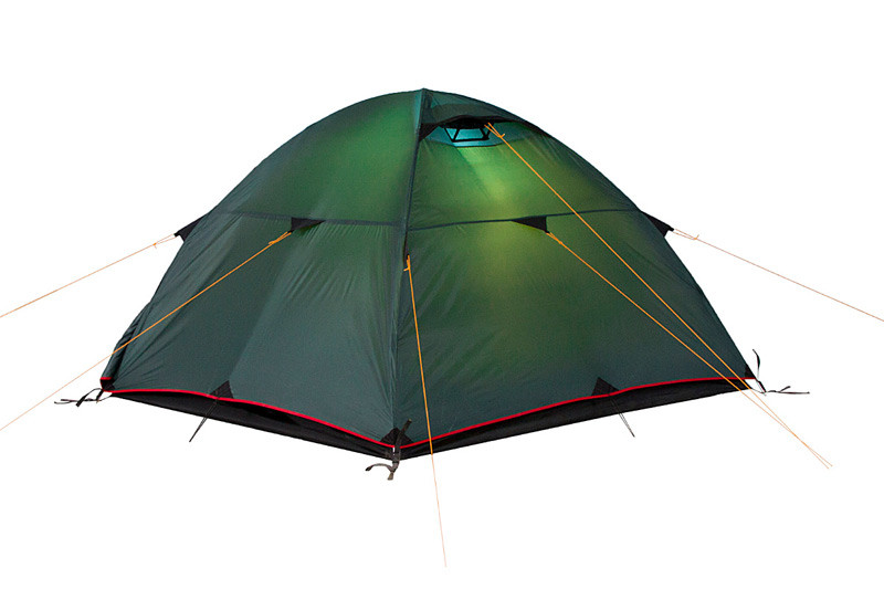 Все узлы, испытывающие повышенные нагрузки, усилены высокопрочной тканью. Край внешнего тента обшит прочной стропой, что значительно уменьшает риск порвать тент ветками и камнями. Стропа красного цвета, поэтому край палатки виден даже в сумерках и густой траве.