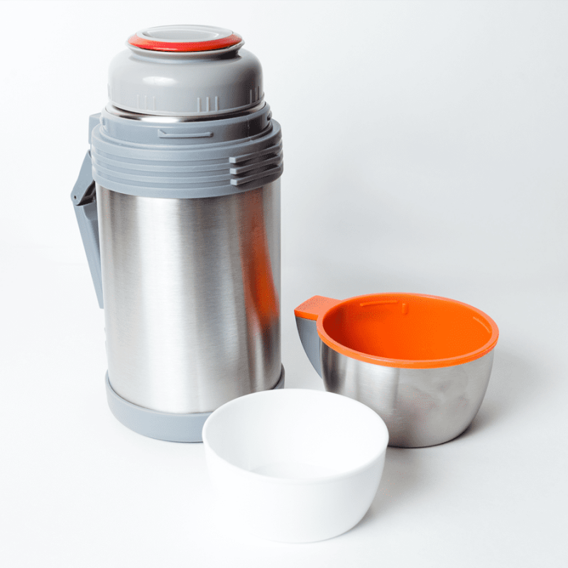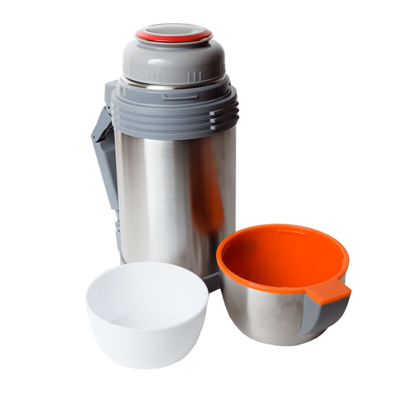 Двойные стенки термоса позволяют долго сохранять температуру, как холодного, так и горячего напитка. Корпус и внутренняя колба термоса изготовлены из высококачественной пищевой нержавеющей стали. Двойная широкая пробка термоса и его горловина, позволяют хранить в термосе, как напитки, так и еду. На боку корпуса расположена ручка, которая раскладывается и убирается одним движением.